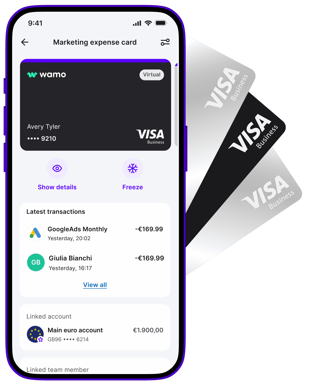 The wamo account is a digital business account that helps you manage your company’s finances efficiently. You can send and receive payments, handle multiple currencies, issue business cards, automate bookkeeping, and control expenses — all from a straightforward, secure platform available on both mobile and desktop.